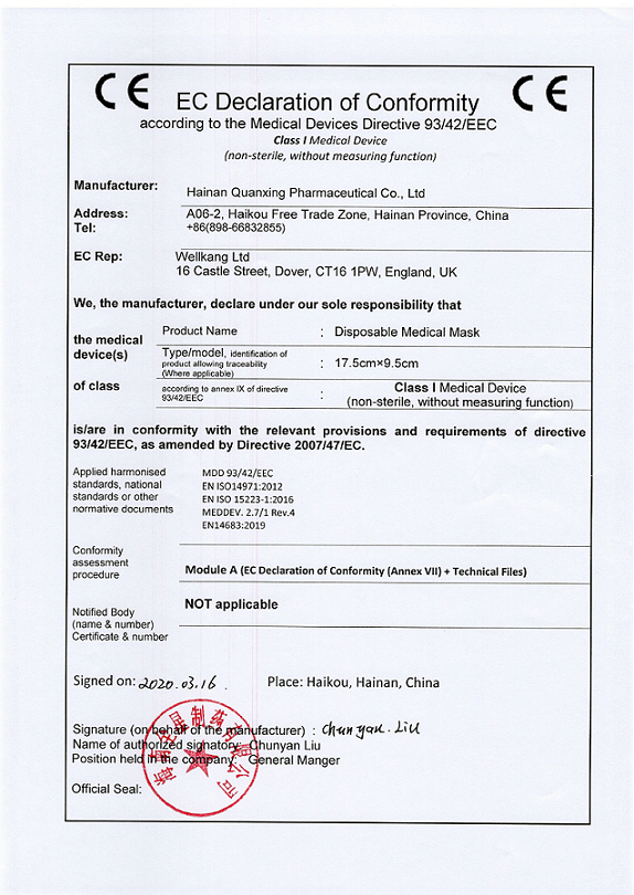 至此我司非無(wú)菌醫(yī)用口罩順利通過(guò)CE認(rèn)證,成為海南省首家醫(yī)用口罩產(chǎn)品通過(guò)歐盟認(rèn)證的企業(yè)。